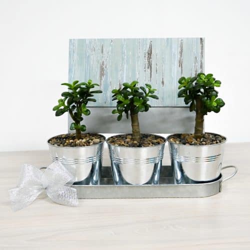 - Bandeja 30 cm de ancho x 2,5 de alto; 3 baldes de 9,5 cm de ancho x 9 cm de alto.